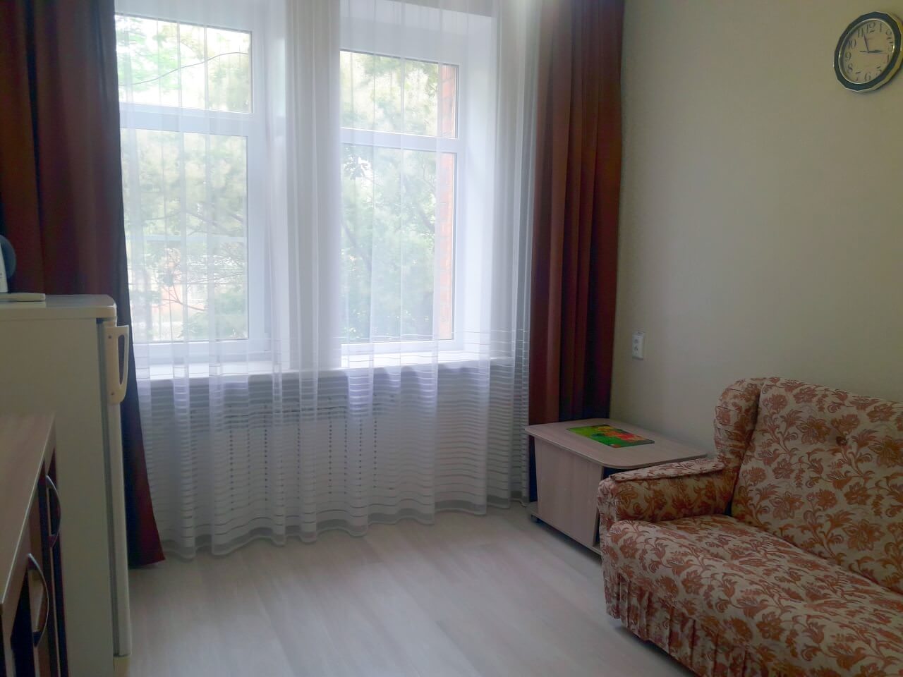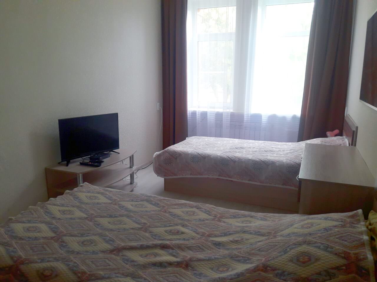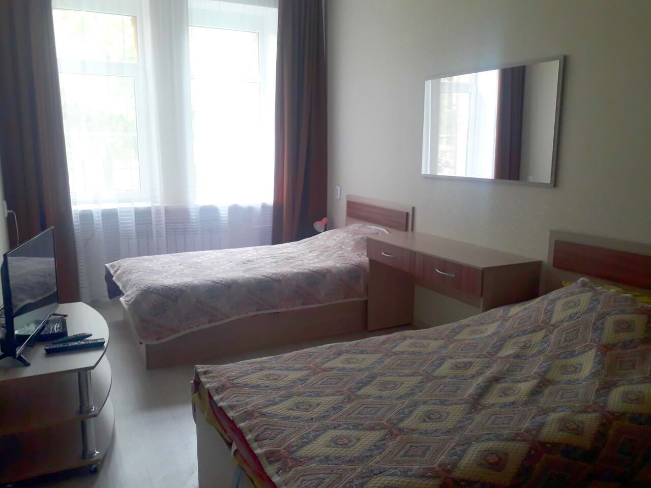 Площадь номера - 16 кв.м. 2 осн. места. 1 доп. место. Мебель: вешалка, диван, зеркало, кровати односпальные, прикроватные тумбочки, стол, столик журнальный, столик туалетный, стулья, тумба под телевизор, шкаф встроенный. Оборудование: набор посуды, сплит-система, телевизор, холодильник, чайный набор посуды. Санузел: с душем (поддон), туалетные принадлежности. Сервис: Wi-Fi бесплатно, смена полотенец, смена постельного белья, уборка номера.